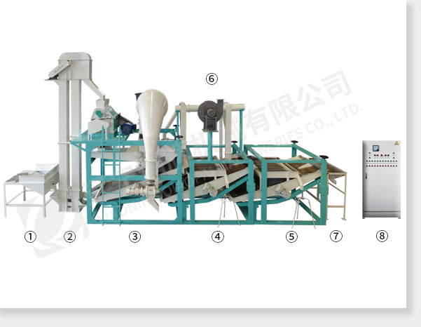 ① 上料斗② 斗式提升機(jī) ③ 脫殼、風(fēng)選、分選主機(jī) ④ 籽米復(fù)選機(jī)1 ⑤ 籽米復(fù)選機(jī)2 ⑥ 風(fēng)力回料系統(tǒng) ⑦ 接料斗 ⑧ 電氣控制柜
